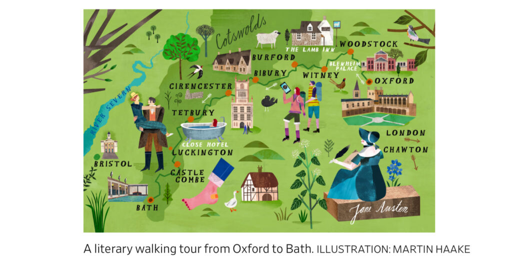 “I prefer walking,” declares Anne Elliot, the heroine of Jane Austen’s “Persuasion.” To celebrate the 250th anniversary of Austen’s birth, my husband and I decided to channel her characters’ love of country strolls, walking from Oxford to Bath, the resort town where Austen lived from 1801 to 1806. A visit to her house in Chawton we’d save for another trip.